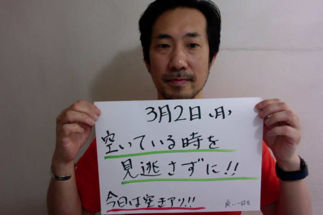 本日、3月2(月)の予約状況は、まだ空きあります。