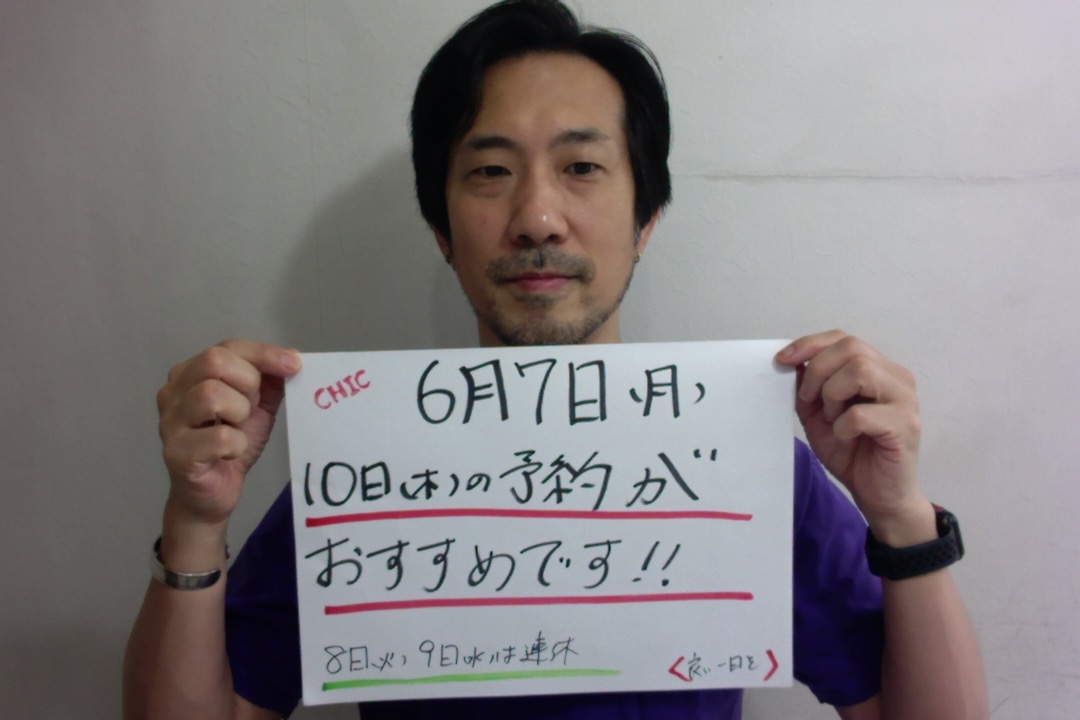 明日、明後日はお休みになり10日(木)がまだ予約が取りやすいのでご利用ください。