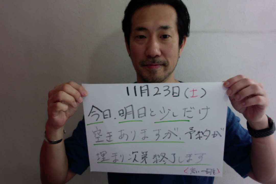 本日、11月23(土)の予約状況は、時間帯や施術内容によってお取りできます。