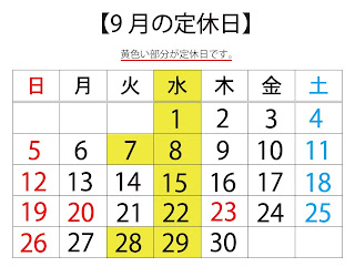 9月の定休日が年間定休日の表示と変更が出ましたのでお知らせです。