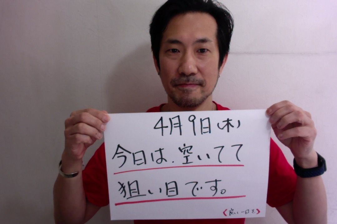 本日、4月9(木)の予約状況は、かなり空きあります。