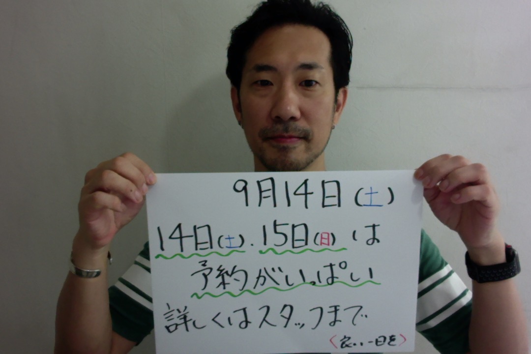 本日、9月14日(土)の予約状況は、いっぱいにより受付終了しました。